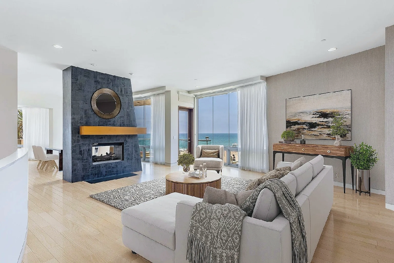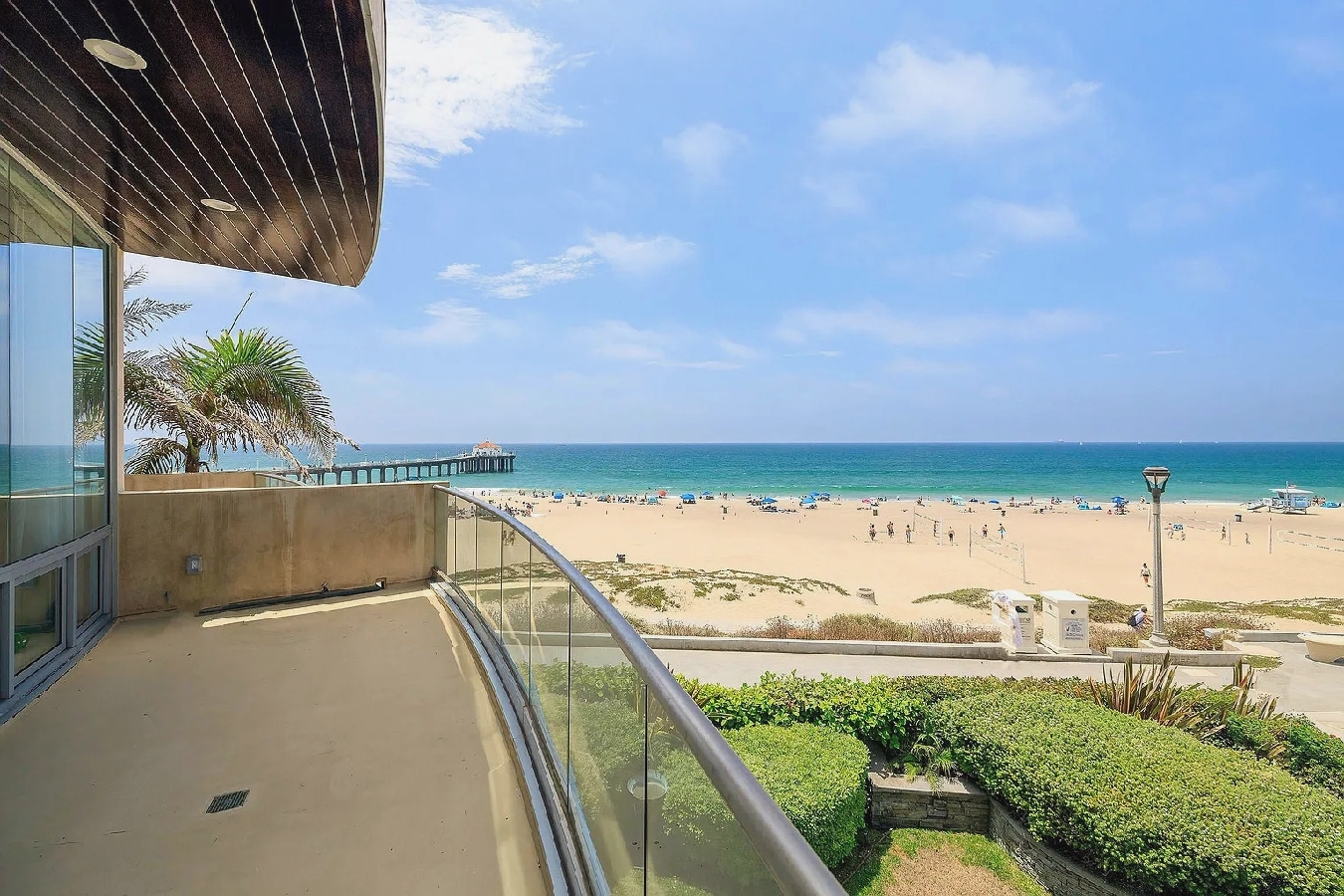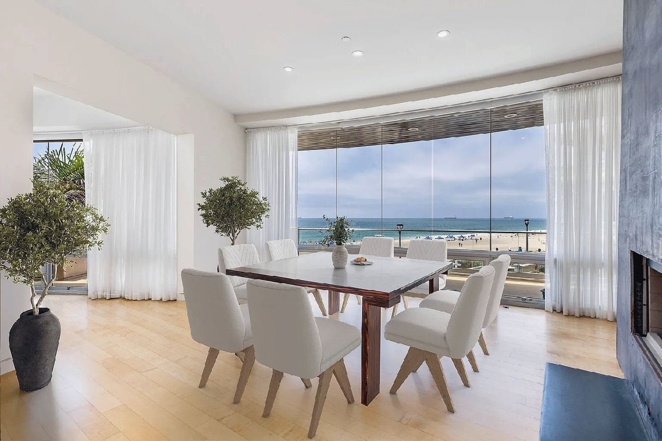 Floor-to-ceiling windows and curved architectural lines fill the spacious interior with natural light while showcasing sweeping views of the Pacific and sandy shoreline; a well-equipped kitchen, generous living areas, and refined modern furnishings create an elevated coastal atmosphere, and guests can step outside to enjoy the beach or walk just a few blocks to nearby cafes, shops, and seaside dining, offering an ideal upscale retreat for families or anyone seeking a polished and memorable Manhattan Beach getaway.