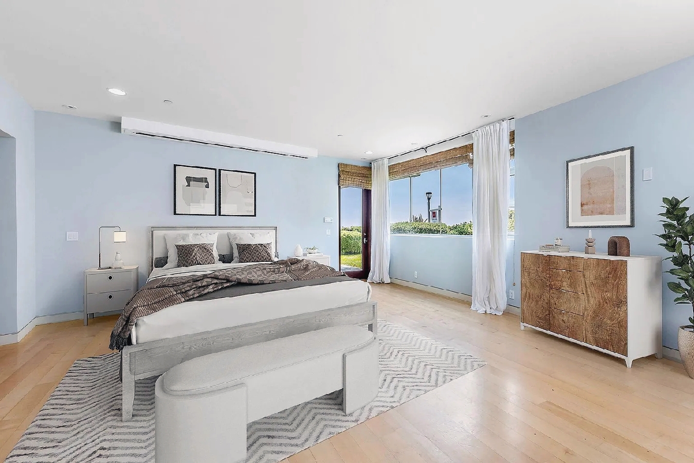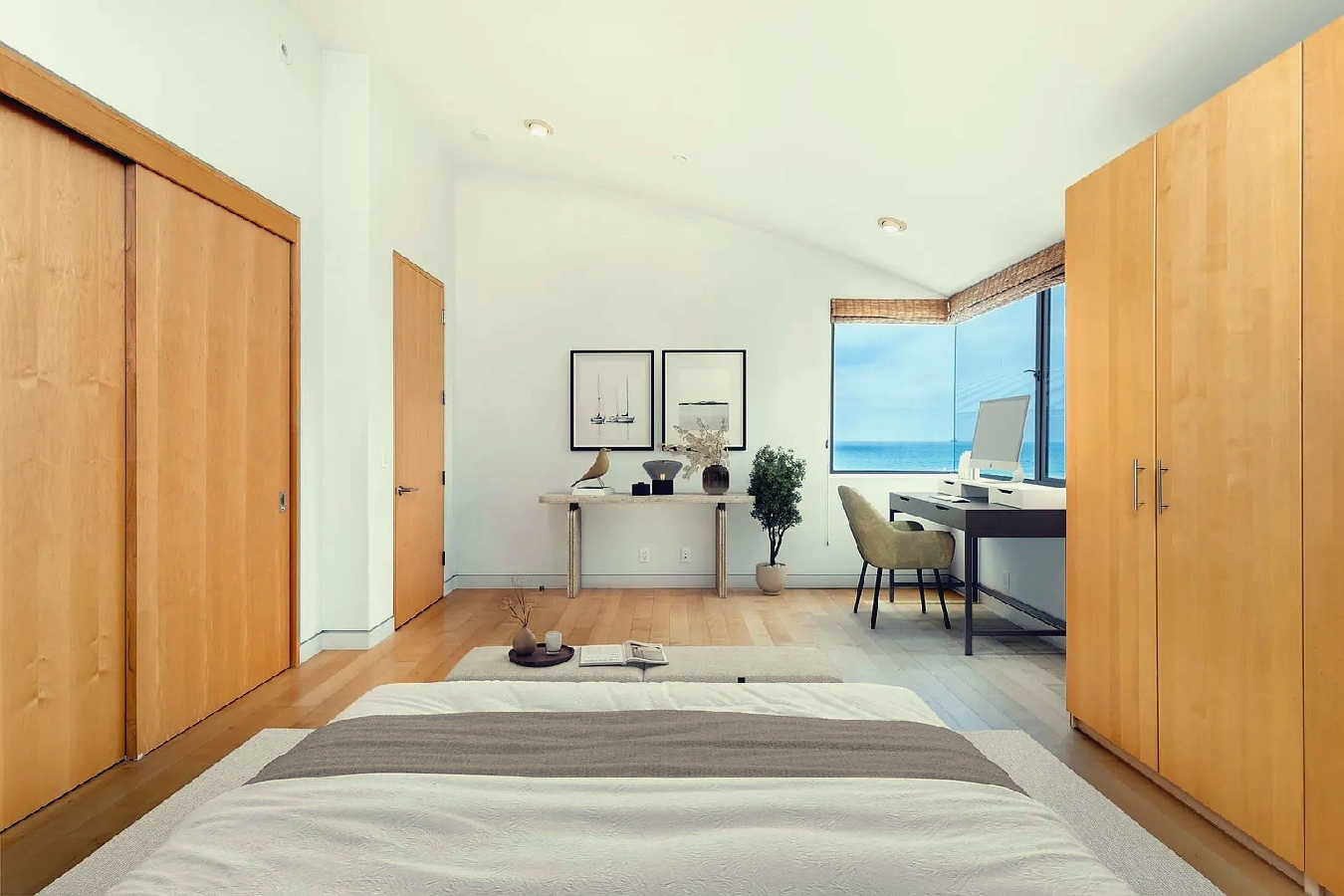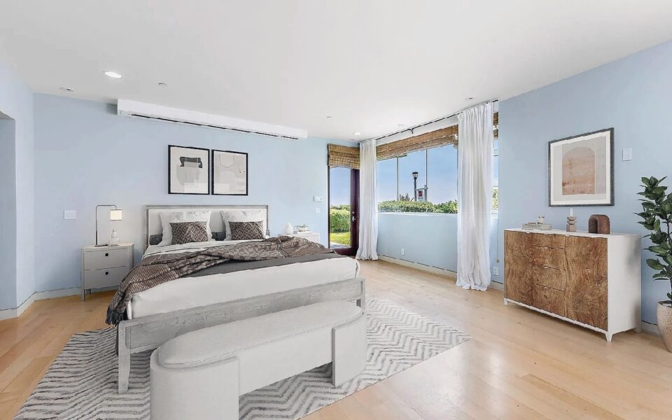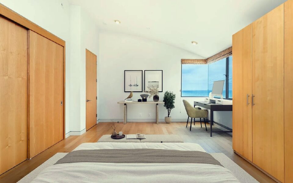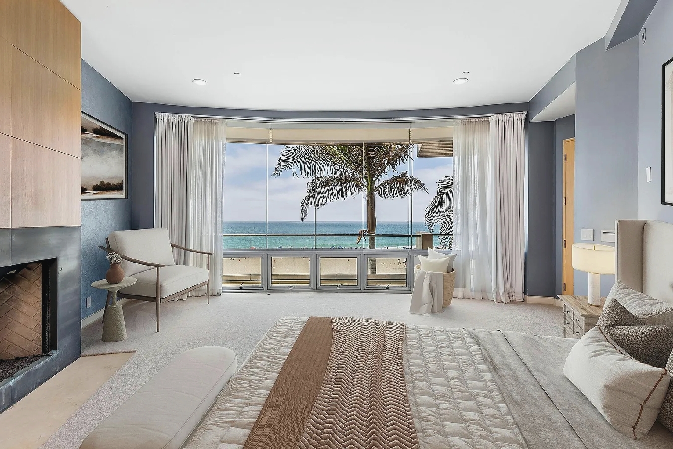Floor-to-ceiling windows and curved architectural lines fill the spacious interior with natural light while showcasing sweeping views of the Pacific and sandy shoreline; a well-equipped kitchen, generous living areas, and refined modern furnishings create an elevated coastal atmosphere, and guests can step outside to enjoy the beach or walk just a few blocks to nearby cafes, shops, and seaside dining, offering an ideal upscale retreat for families or anyone seeking a polished and memorable Manhattan Beach getaway.