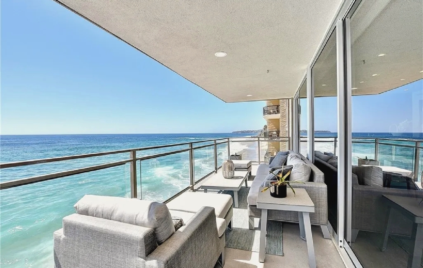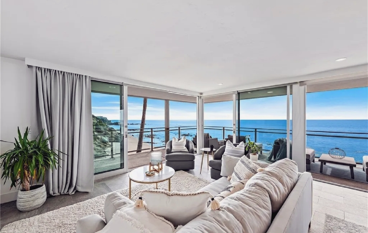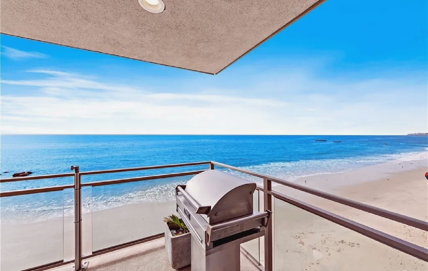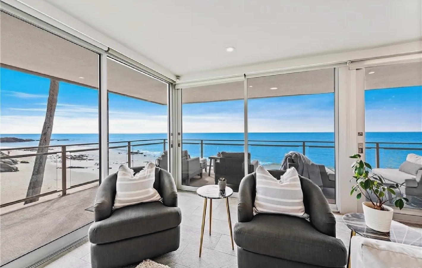 Floor-to-ceiling glass doors and an expansive wraparound balcony frame sweeping coastal views, while a modern open layout with a gourmet kitchen, quartz counters, and elegant stone flooring creates a refined oceanfront setting; the primary suite offers a spa-inspired bath with a soaking tub, walk-in shower, and heated floors, and guests can enjoy in-unit laundry, smart home features, high-efficiency appliances, and access to a heated saltwater pool, direct beach entry, secure parking, and nearby parks, dining, and local attractions for an unforgettable Laguna Beach getaway.
