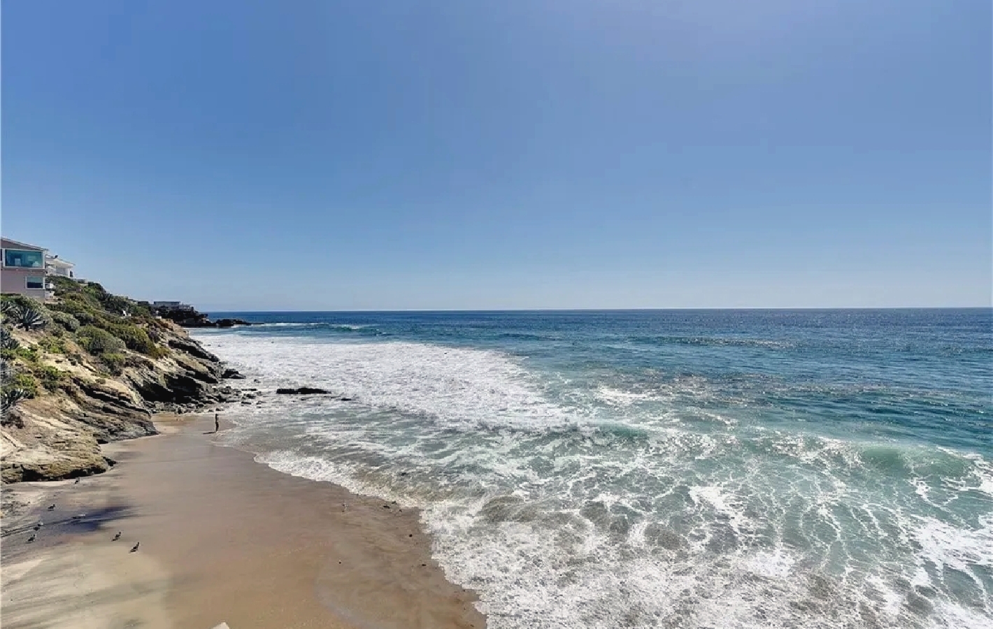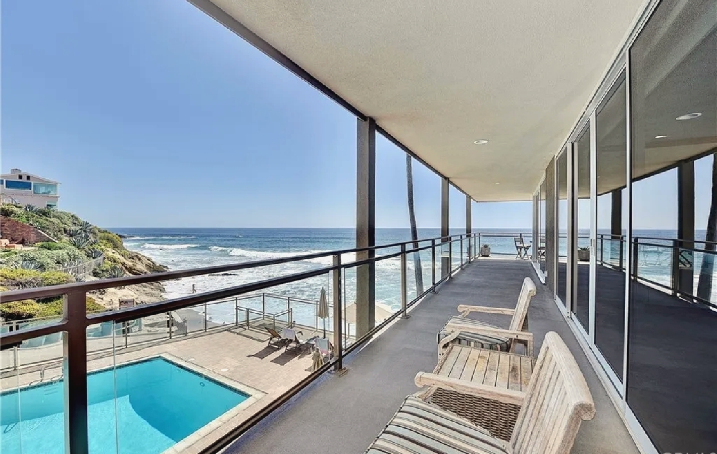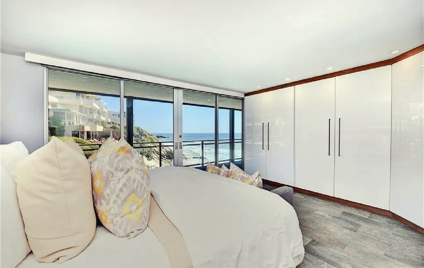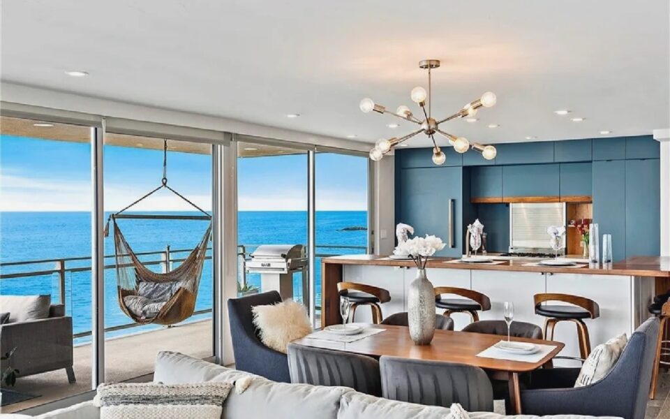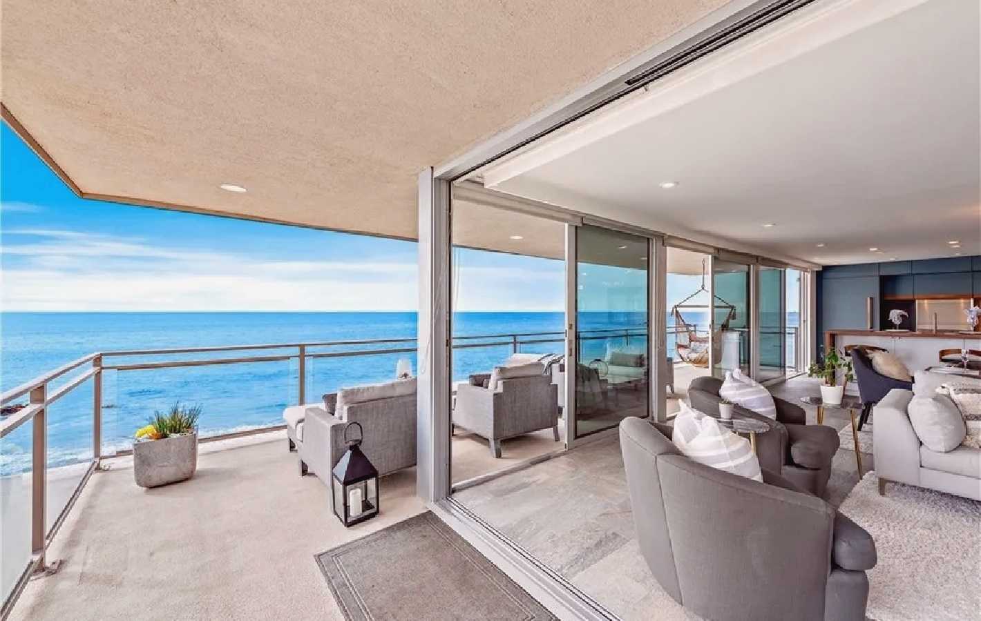 Floor-to-ceiling glass doors and an expansive wraparound balcony frame sweeping coastal views, while a modern open layout with a gourmet kitchen, quartz counters, and elegant stone flooring creates a refined oceanfront setting; the primary suite offers a spa-inspired bath with a soaking tub, walk-in shower, and heated floors, and guests can enjoy in-unit laundry, smart home features, high-efficiency appliances, and access to a heated saltwater pool, direct beach entry, secure parking, and nearby parks, dining, and local attractions for an unforgettable Laguna Beach getaway.