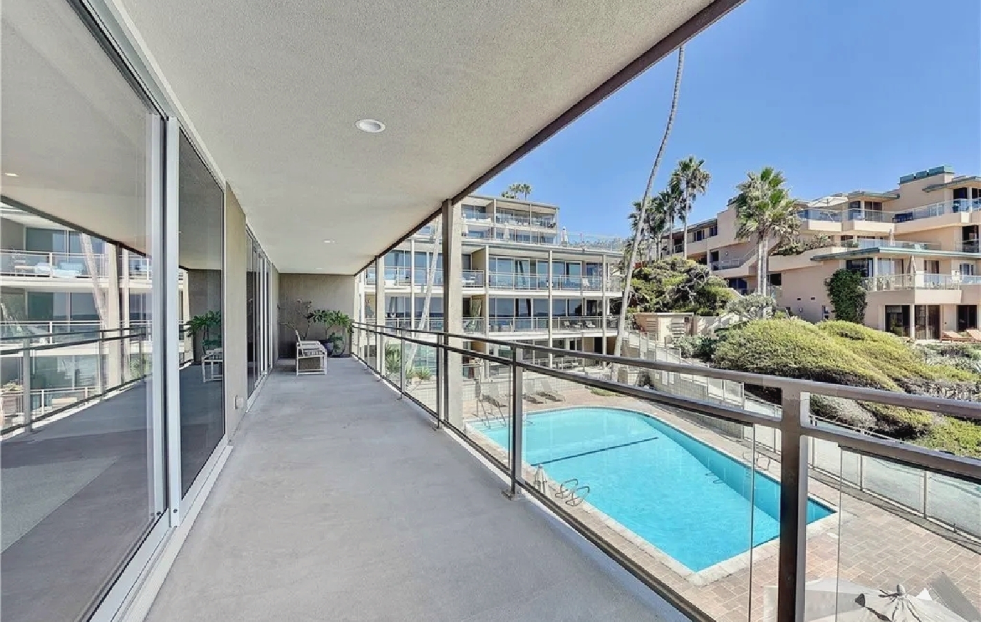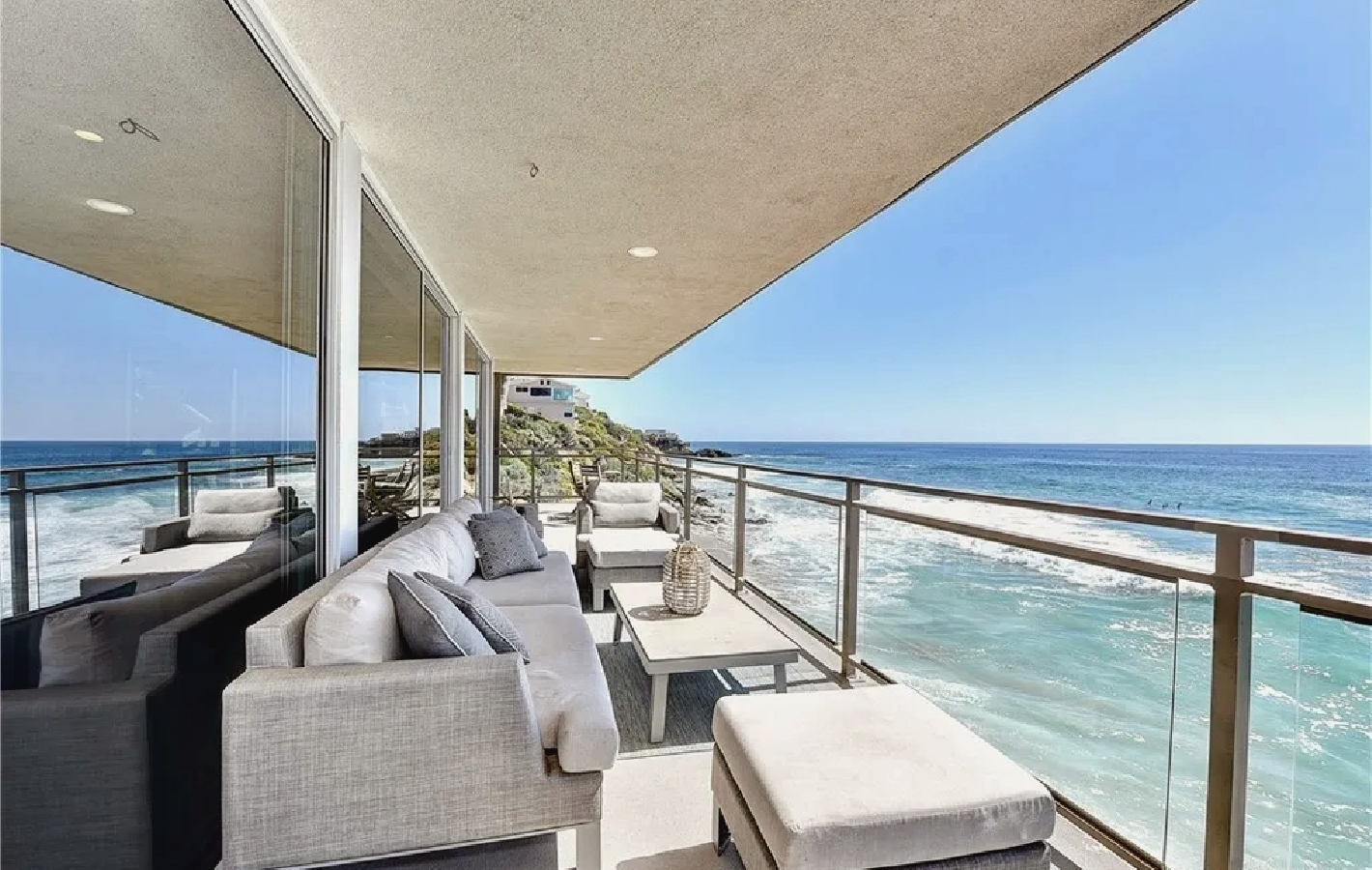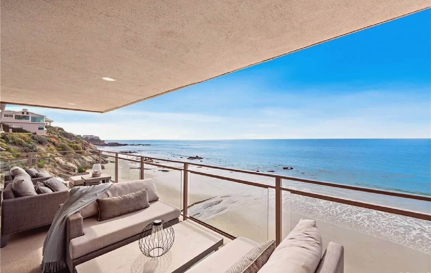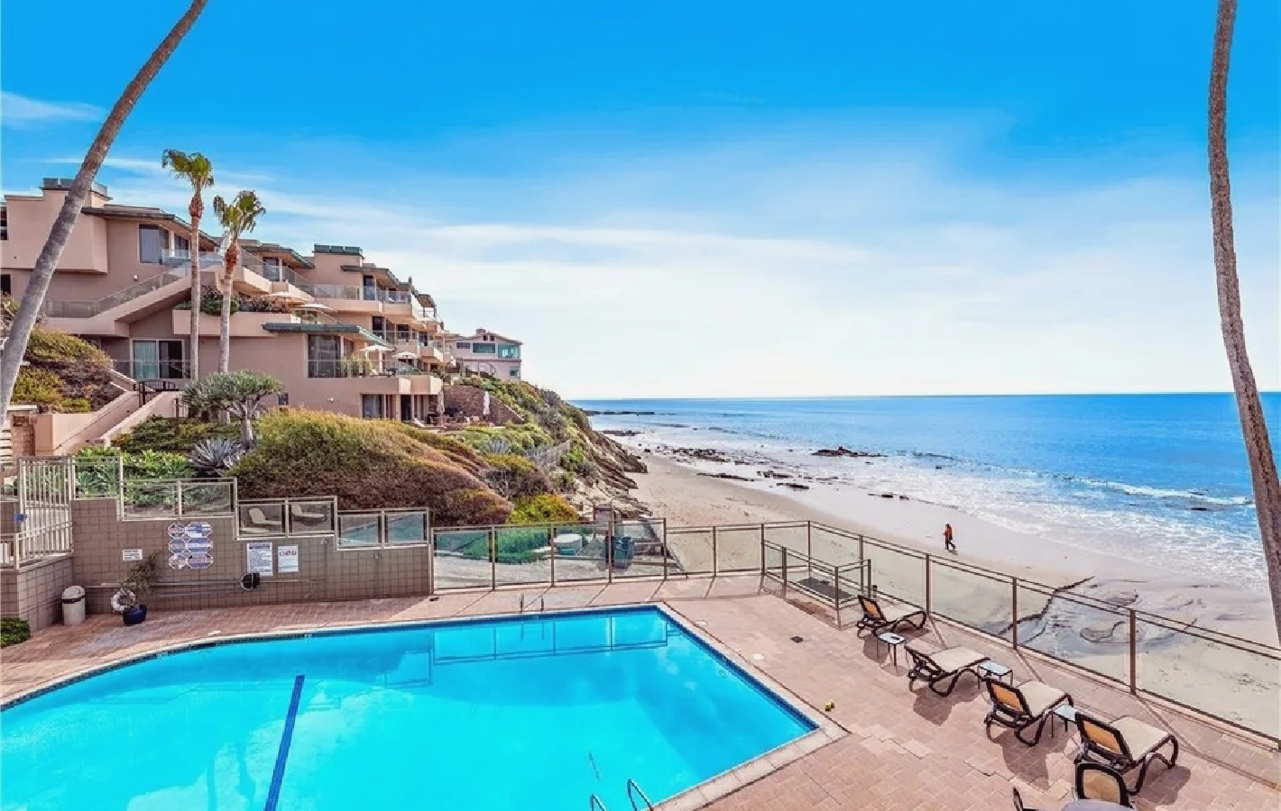 Floor-to-ceiling glass doors and an expansive wraparound balcony frame sweeping coastal views, while a modern open layout with a gourmet kitchen, quartz counters, and elegant stone flooring creates a refined oceanfront setting; the primary suite offers a spa-inspired bath with a soaking tub, walk-in shower, and heated floors, and guests can enjoy in-unit laundry, smart home features, high-efficiency appliances, and access to a heated saltwater pool, direct beach entry, secure parking, and nearby parks, dining, and local attractions for an unforgettable Laguna Beach getaway.