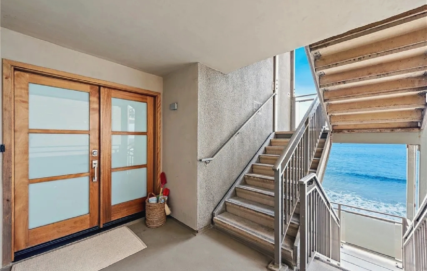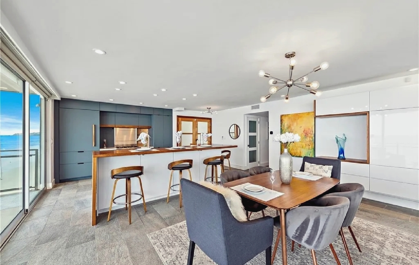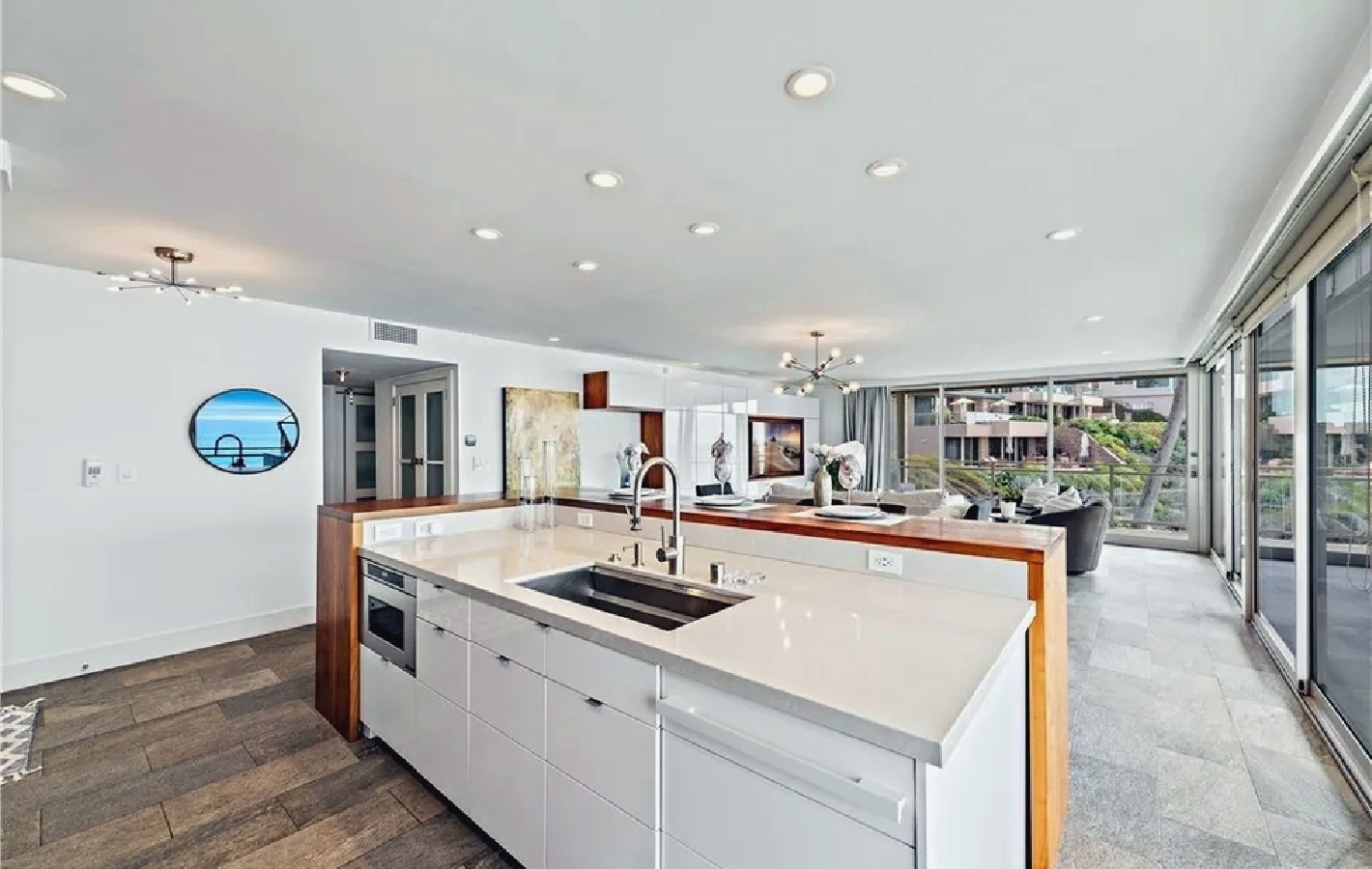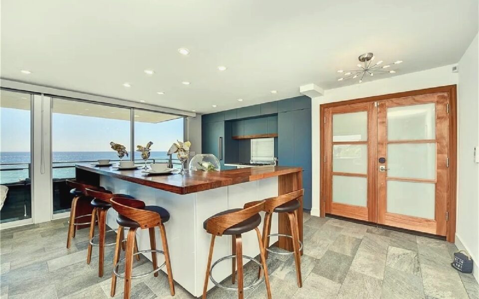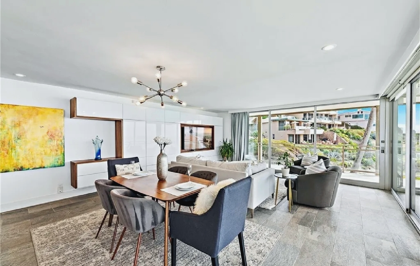 Floor-to-ceiling glass doors and an expansive wraparound balcony frame sweeping coastal views, while a modern open layout with a gourmet kitchen, quartz counters, and elegant stone flooring creates a refined oceanfront setting; the primary suite offers a spa-inspired bath with a soaking tub, walk-in shower, and heated floors, and guests can enjoy in-unit laundry, smart home features, high-efficiency appliances, and access to a heated saltwater pool, direct beach entry, secure parking, and nearby parks, dining, and local attractions for an unforgettable Laguna Beach getaway.