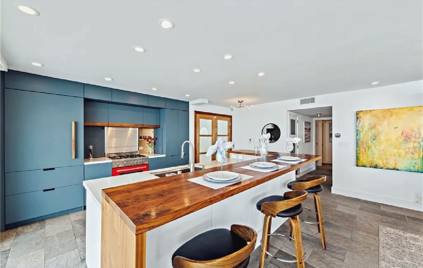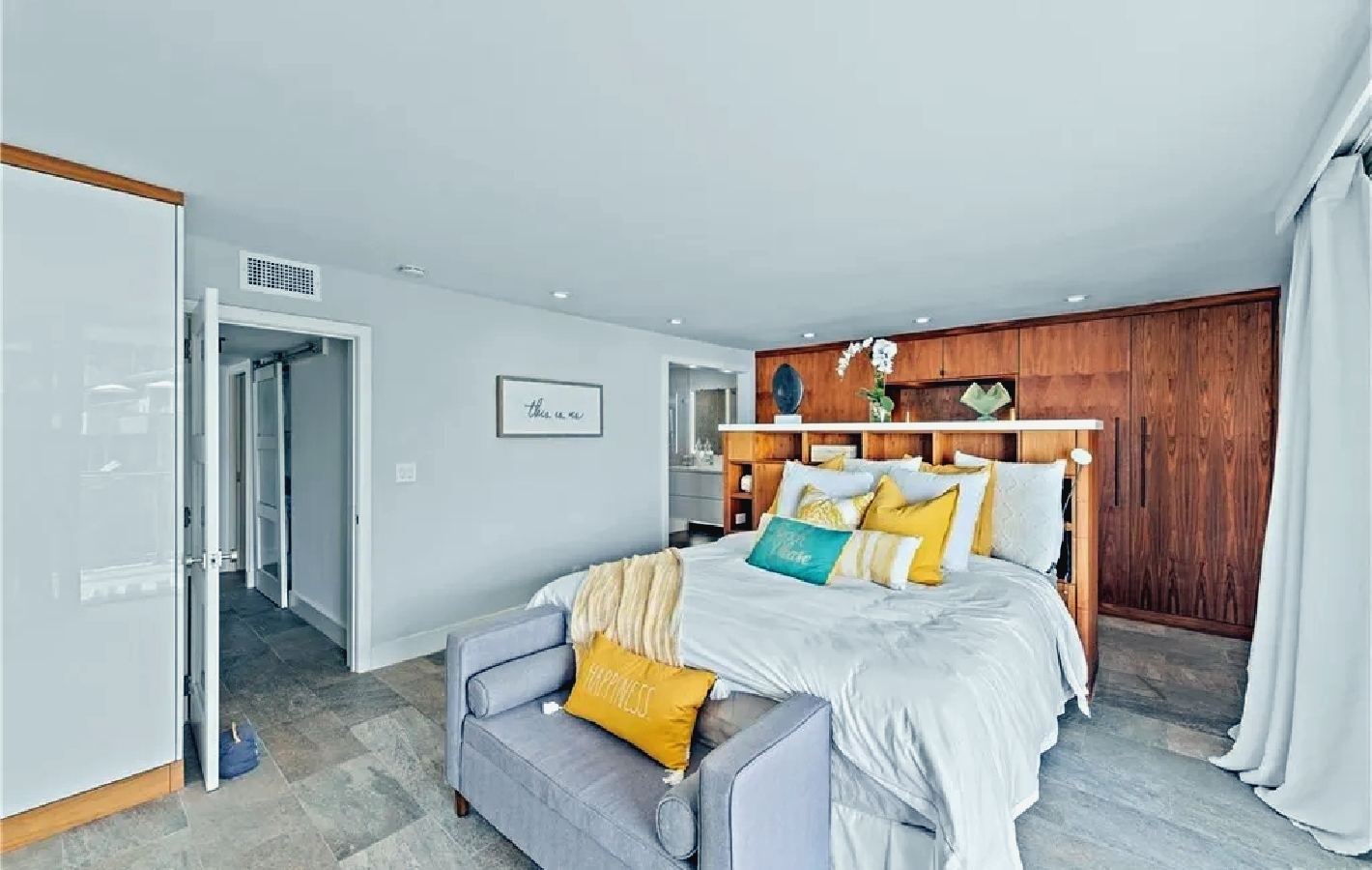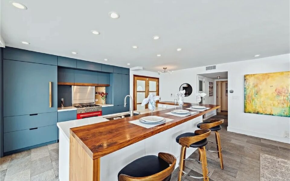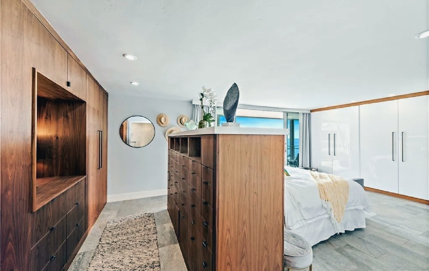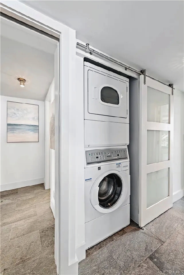 Floor-to-ceiling glass doors and an expansive wraparound balcony frame sweeping coastal views, while a modern open layout with a gourmet kitchen, quartz counters, and elegant stone flooring creates a refined oceanfront setting; the primary suite offers a spa-inspired bath with a soaking tub, walk-in shower, and heated floors, and guests can enjoy in-unit laundry, smart home features, high-efficiency appliances, and access to a heated saltwater pool, direct beach entry, secure parking, and nearby parks, dining, and local attractions for an unforgettable Laguna Beach getaway.